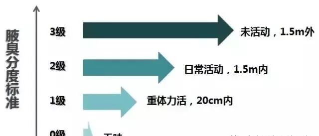 1米以内至30~40厘米以外能嗅知腋部异味,腋毛上极少黄色分泌物结晶,则为中度狐臭,介于轻度和重度狐臭之间。如在腋下夹上纱布,放上2~3分钟后,取下来的纱布上有味儿。通过相关设备检查可见腋部大汗腺分布较密。