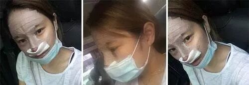到医院跟院长商谈过后,第二天就实施了手术,这是刚做完手术时拍的照片,额头和鼻子包裹的很严实,医生给开了药叮嘱了术后护理注意事项后,我就出院了。