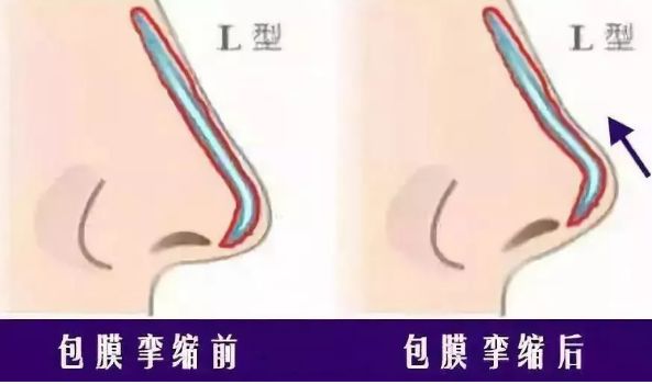 包膜的挛缩就会造成硅胶假体的挤压变短,而L型假体的形状鼻梁部位和鼻尖部位是连在一起的,这时候假体遭到包膜的挤压不仅鼻子会变短,连带着鼻尖也会上翘变成朝天鼻。